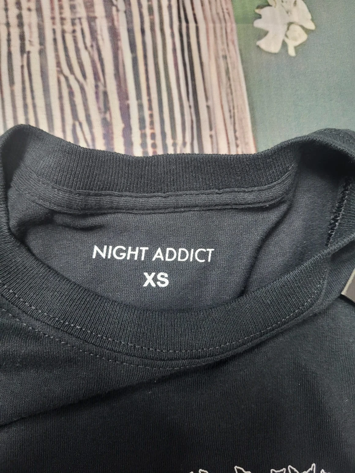 Nowa czarna koszulka Night Addict z oryginalnym, dużym kolorowym nadrukiem na plecach rozmiar XS