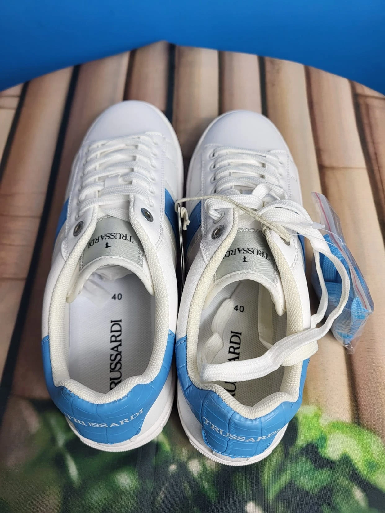 Trussardi SNK AURA – białe sneakersy męskie z niebieskimi akcentami