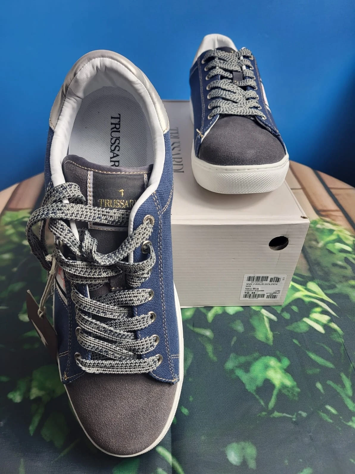 Styl premium w codziennym wydaniu – sneakersy od Trussardi to połączenie elegancji i miejskiego luzu. Model Danus Golden Mix wyróżnia się nowoczesnym designem, gdzie granatowa cholewka zestawiona jest z szarym przodem oraz stylowymi detalami w kolorze złotym.